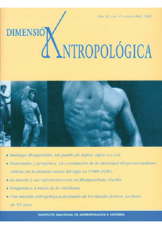 - - Santiago Mexquititlán: un pueblo de indios, siglos XVI-XVIII por Adrián Valverde López. - Desterrados y peregrinos. La constitución de la identidad del pentecostalismo chileno en la primera mitad del siglo XX (1909-1950) por Miguel Ángel Mansilla Agüero. - La muerte y sus representaciones en Huaquechula, Puebla por Jaime Enrique Carreón Flores. - Terapéutica a través de la obsidiana por Ana Ma. Álvarez Palma y Gianfranco Cassiano V. - Una mirada antropológica al estudio de los rituales festivos. La fiesta de XV años por Juan Miguel Sarricolea Torres y Albertina Ortega Palma. - Dentro y fuera de las figuraciones visuales rarámuri por Alejandro González Villarruel y Héctor Parra Zurita. - Guilhem Olivier (coord.) y Miguel León-Portilla (pról.), Viaje a la Huasteca con Guy Stresser-Péan, México, CEMCA/FCE (Sección de Obras de Antropología), 2008 por Félix Baéz-Jorge. - Emmanuel Désveaux, Spectres de l’anthropologie. Suite nord-américaine, París, Aux lieux d’être (Sciences Contemporaines), 2007 por Johannes Neurath. - María Concepción Lugo Olín, Relatos de ultratumba. Antología de ejemplos sobre el purgatorio, México, INAH, 2007 por José Abel Ramos Soriano.
