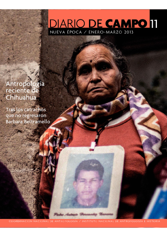 - - Presentación. - La investigación arqueológica en Tamaulipas durante el cambio de siglo y la primera década del siglo XXI por Gustavo A Ramírez Castilla. - Antropología reciente en Chihuahua por Esperanza Penagos Belman y José Francisco Lara Padilla. - Archivos y transparencia en Chihuahua por Sofía Pérez Martínez. - Avances en el estudio de los cazadores-recolectores del norte centro por Arturo Guevara Sánchez. - El ejercicio del peritaje antropológico en Chihuahua. El escenario jurídico por Víctor Hugo Villanueva. - Globalización, identidad y lucha agraria en el noroeste de Chihuahua por Esperanza Penagos Belman. - Religión, un concepto insuficiente para el caso rarámuri en el Alto Río Conchos por Abel Rodríguez. - Territorialidad y gobierno indígena entre los rarámuris de la Sierra de Chihuahua por Juan Luis Sariego Rodríguez. - El peritaje antropológico en la sierra Tarahumara. Hacia una interculturalidad más equitativa. Clasificación y sistematización del acervo de peritaje antropológico realizados en el estado de Chihuahua por José Francisco Lara Padilla. - Oralidad guarijío: sabiduría indígena y normatividad social por Claudia Jean Harriss Clare. - El camino Real de tierra adentro un sendero recorrido por Elsa Rodríguez García. – Tras los catrachos que no regresaron por Barbara Beltramello. - La pendiente reconciliación con las culturas de Sonora. Entrevista con la doctora Raquel Padilla por alma Olguín Vázquez. Incursiones. Teresa Mora Vázquez, Testimonios de Tizapán. Memoria y olvido de un pueblo originario de la Ciudad de México, México, INAH, 2012 por Mette Wacher. - Incursiones. Luis Eduardo Gotés, Ana Paula Pintado, Nicolás Olivos, Angélica Pacheco, Marco Vinicio Morales y Daniela de la Parra (colores.), Los pueblos indígenas de Chihuahua. Atlas etnográfico, México, INAH, 2012 por Ana Paula Pintado Cortina. - Incursiones. Ana Paula Pintado, Los hijos de Riosi y y Riablo. Fiestas grandes y resistencia cultural en una comunidad tarahumara de la barranca, México, INAH (Eestudios monográficos, Etnografía de los Pueblos Indígenas de México), 2012 por Sergio Raúl Arroyo. - El Paseo de la Reforma en la mirada del doctor Silvio Zavala por Beatriz Nieves. - Músicos del son reciben el Premio Nacional de Ciencias y Artes 2012.