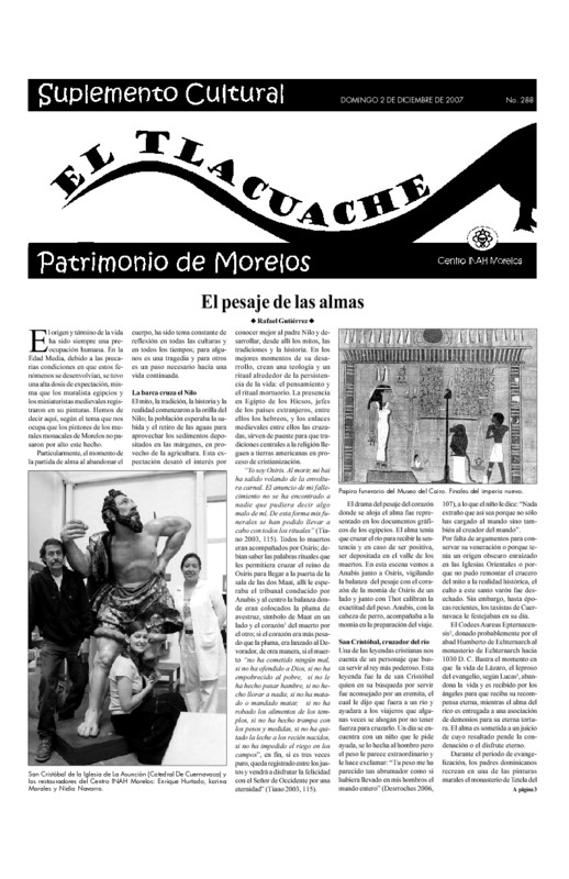 - El pesaje de las almas por Rafael Gutiérrez. - Presencias e ideas sobre los muertos en la regióndel Alto Balsas, Guerrero por Adriana Saldaña Ramírez. - Las mojigangas en Morelos por Miguel Morayta Mendoza.