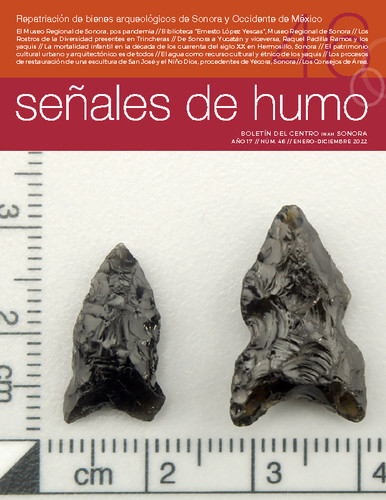 - - Editorial por Patricia Olga Hernández Espinoza. - Repatriación de bienes arqueológicos de Sonora y Occidente de México por Adriana Hinojo Hinojo y Júpiter Martínez Ramírez. - El Museo Regional de Sonora, pos pandemia por Martha Olivia Solís Zataraín. - Biblioteca "Ernesto López Yescas", Museo Regional de Sonora por Gloria Elizabeth Salcido Tabanico. - Los rostros de la diversidad presentes en Trincheras por Rogelio MarcialLeón Ruiz. - De Sonora a Yucatán y Viceversa Raquel Padilla Ramos y Los Yaquis por Esperanza Donjuan Espinoza, Zulema Bujanda Álvarez y Juan José Gracida Romo. - La mortalidad infantil en la década de los cuarenta del Siglo XX en Hermosillo, Sonora por Patricia Olga Hernández Espinoza. - El patrimonio cultural urbano y arquitectónico es de todos por Verónica Gutiérrez López, Anabel Leyva Hernández, Omar Jara Domínguez y Pavel Humberto Tiburcio Verdugo. - El agua como recurso cultural y étnico de los yaquis por José Luis Moctezuma Zamarrón. - Los consejos de área por María Elisa Villalpando Canchola.
