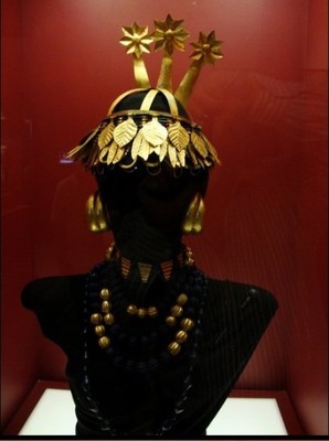 - En la tumba de la reina Puabi se hallaron varias osamentas femeninas, al parecer de cortesanas a su servicio. Los componentes vegetales y florales de sus tocados probablemente simbolizaban la fecundidad. Los materiales demuestran la prosperidad de la ciudad de Ur: el oro, la plata y el cobre debieron importarse de Irán, por vía terrestre o marítima. El lapislázuli llegaba de Afganistán y la coralina, de la región del Indo. Las piezas originales son ejemplos tempranos de filigrana, lámina y granulado en oro.