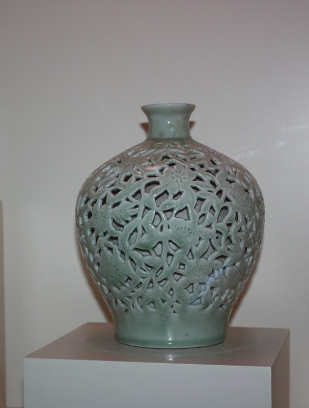 - La técnica de motivos calados evolucionó durante la dinastía Joseon (1392-1910) y con ella se crearon objetos que incluyen un recipiente interior, como el ejemplar moderno aquí exhibido. Está inspirado en el jarrón de porcelana blanca del siglo XVIII –Tesoro Nacional no. 240–, de complejo e inusual diseño que contrasta con la simplicidad de otras piezas de ese período.