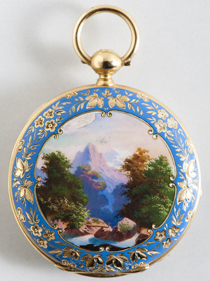 - Reloj de bolsillo elaborado en oro de 18 quilates. Consta de cinco partes abatibles, cuatro por medio de bisagras y una por medio de un perno; las protecciones externas del armazón están esmaltadas, la parte de enfrente tiene el paisaje de una montaña, árboles y un río, y en la parte posterior se encuentra un ramo de flores; la protección de la maquinaria tiene inscripciones y dos perforaciones para la cuerda; la carátula está porcelanizada con números romanos impresos en negro, tiene un círculo más pequeño con manecilla para los segundos y tiene protección de vidrio.