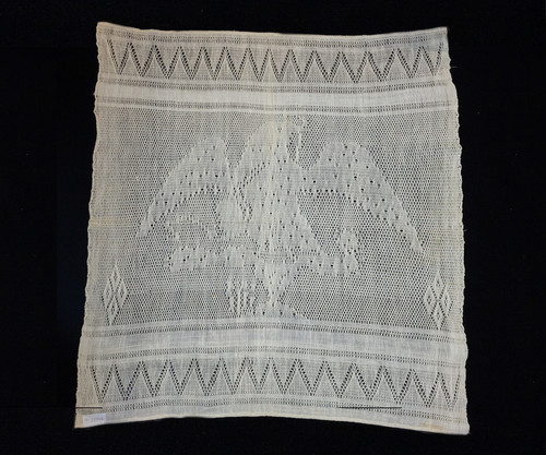 - Este bello textil muestra el escudo nacional con el águila republicana realizada en un detallado deshilado.