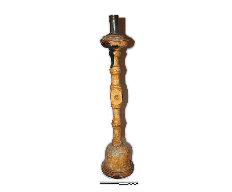 - Candelabro con el soporte de madera, de base circular cuerpo torneado decorado con motivos florales en relieve, y boquilla cilíndrica elaborada con lamina de cobre clavada. El soporte de madera pintado en color amarillo.